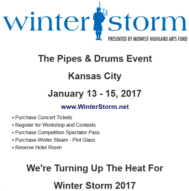 The 16th annual Winter Storm Pipes & Drums Event is currently open for registration.  Please visit the Winter Storm website for more information on how to register, event details, etc.